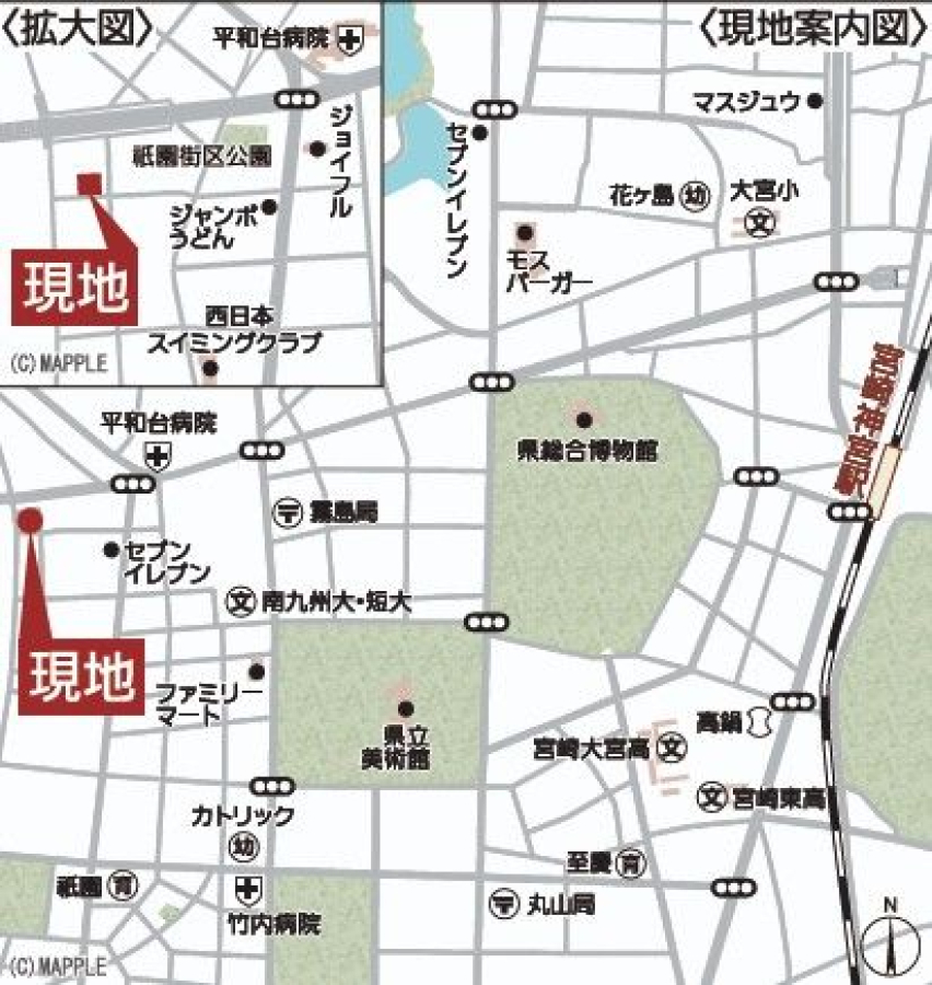 | 公園 | 150 m (祇園街区公園) | 銀行 | 700 m (宮崎太陽銀行 平和台支店) |
