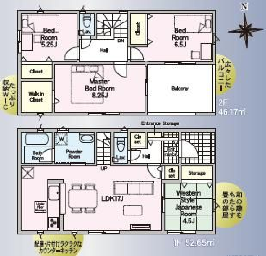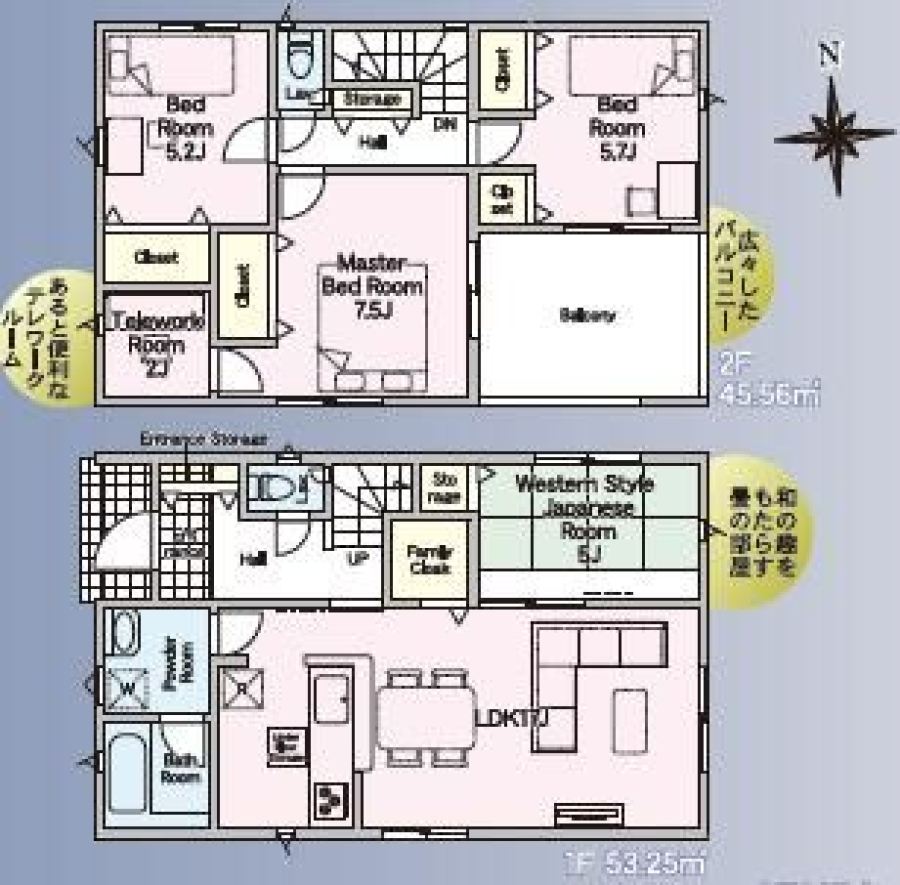 | 間取り/階数 | 4LDK((1F)LDK17帖・和5帖 (2F)洋7.2帖・洋5.7帖・洋5.2帖) / 地上2階 | ||