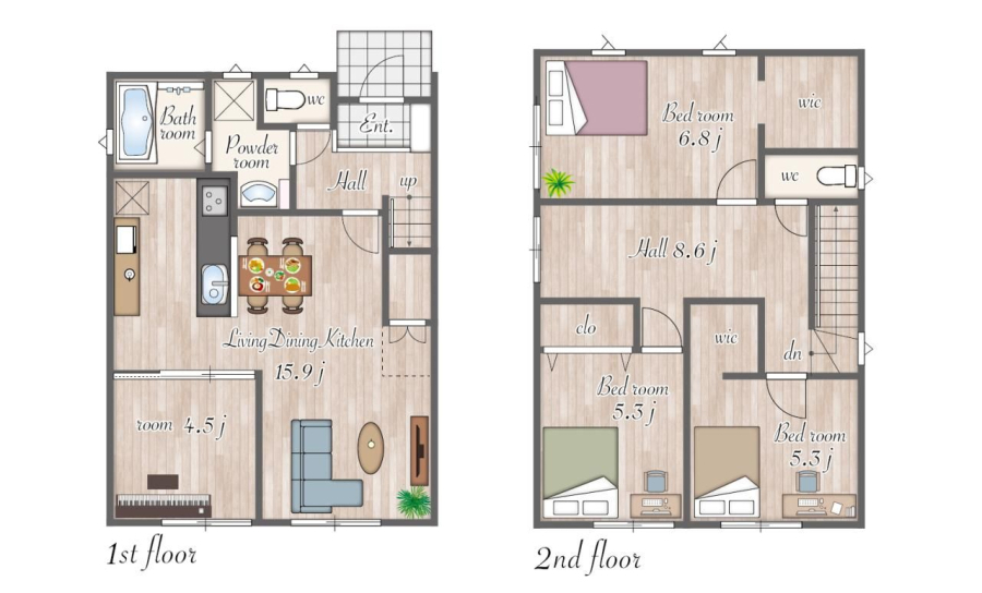 | 間取り/階数 | 4LDK((1F)LDK15.9帖・洋4.5帖 (2F)洋6.8帖・洋5.3帖・洋5.3帖) / 地上2階 | ||