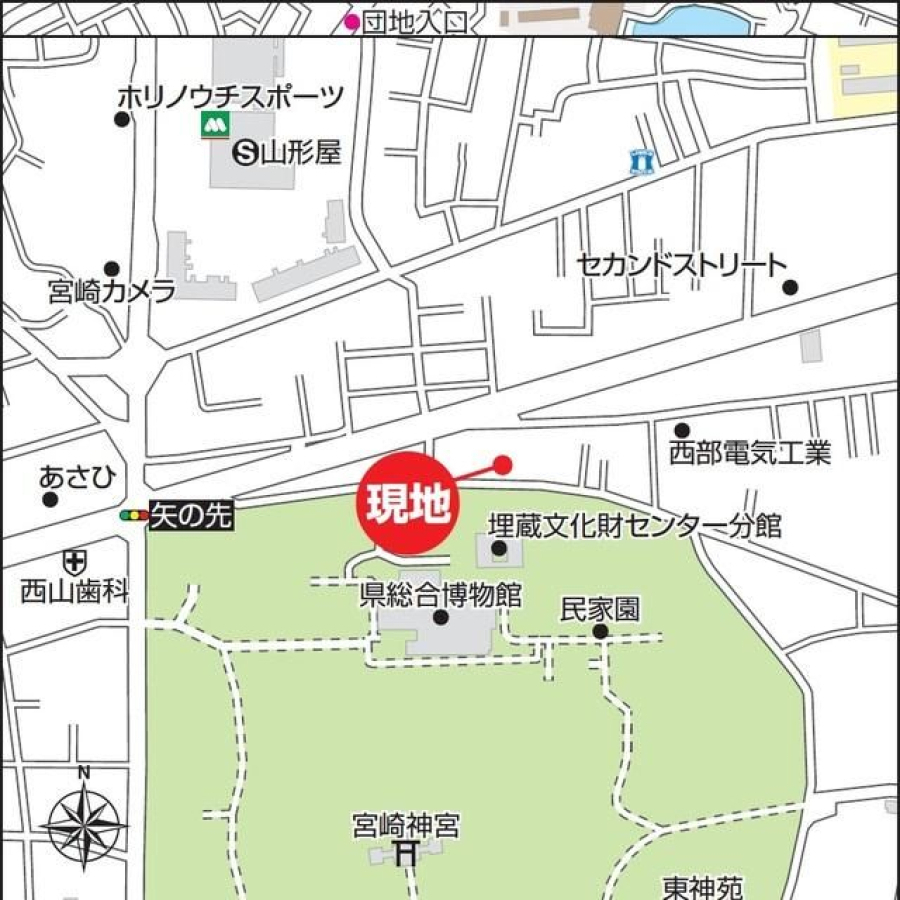 | 公園 | 430 m (神宮ふれあい緑地広場) | 銀行 | 600 m (宮崎銀行 神宮支店) |