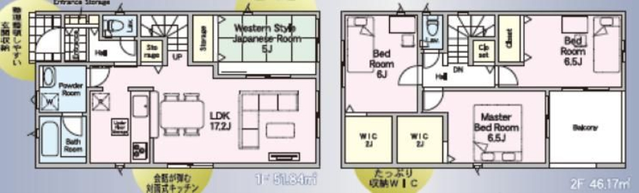 | 間取り/階数 | 4LDK((1F)LDK17.2帖・和5帖 (2F)洋6.5帖・洋6.5帖・洋6帖) / 地上2階 | ||