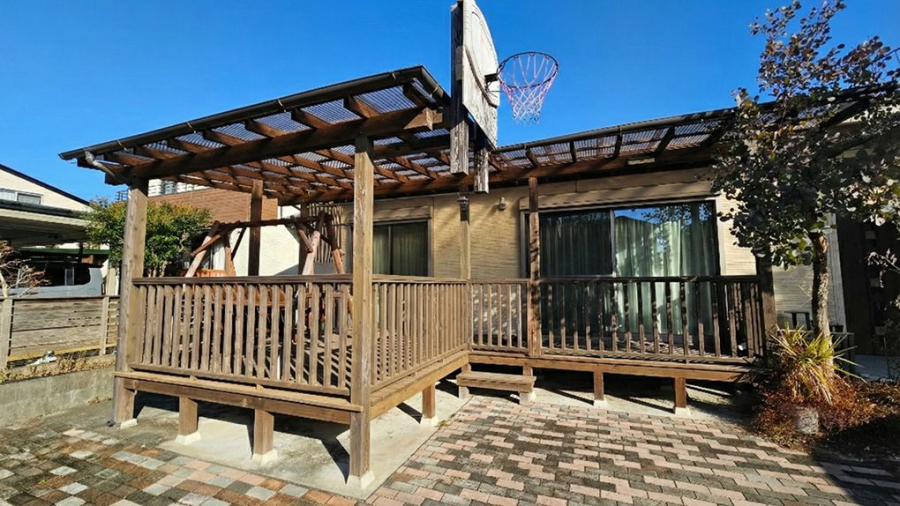 パーゴラ仕様の屋根を備えた広々としたウッドデッキは、ただのお庭の延長ではなく、「第二のリビング」のように使えます。