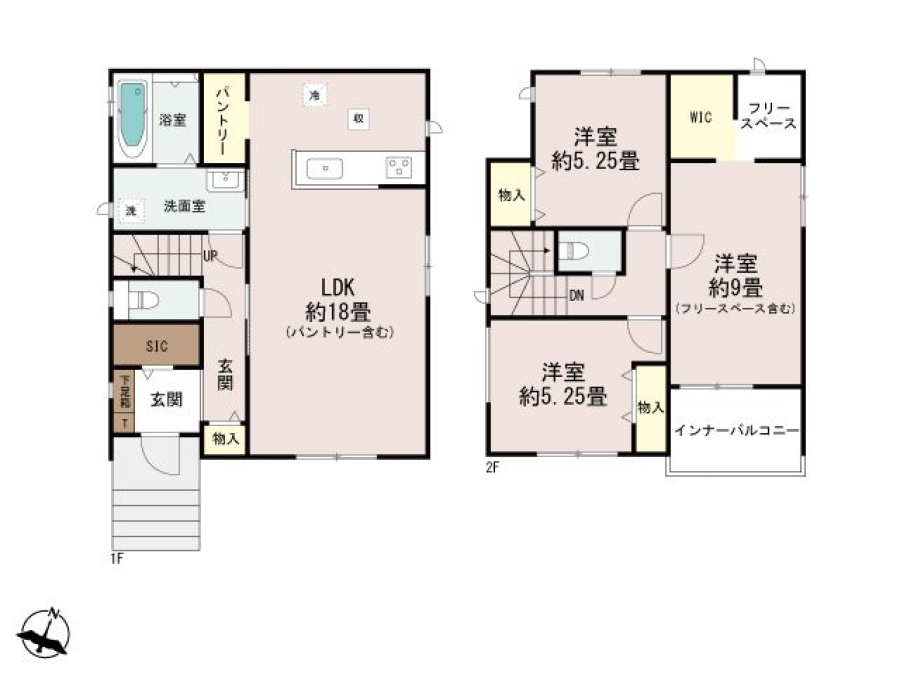 2階にはウォークインクローゼットや収納や趣味スペース等お好きに使用できるフリースペースがあります!1階は、家族と会話しながらお料理もできる対面式キッチン仕様、キッチンのすぐ横にはパントリーも付いていますので、キッチン用品の収納等にも便利です。玄関にはシューズインクローゼットとシューズボックスの両方が付いているので、家族の靴等も楽々収納可能♪駐車場は約2台駐車可能です!
