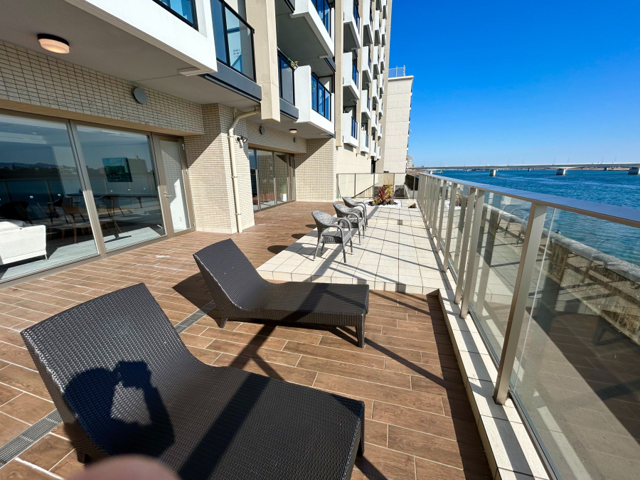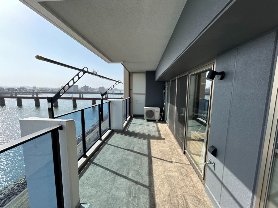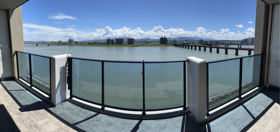 - 〇リバービュー南向きバルコニー。ガラス手すりで眺望良好