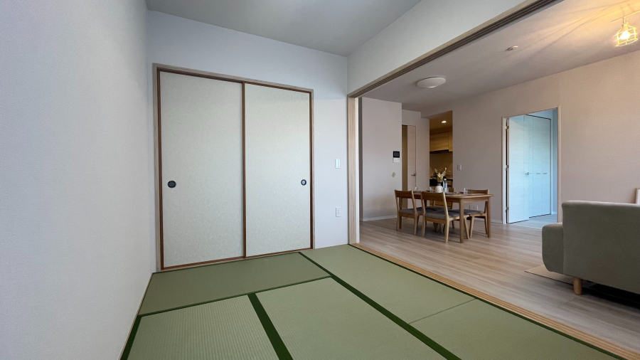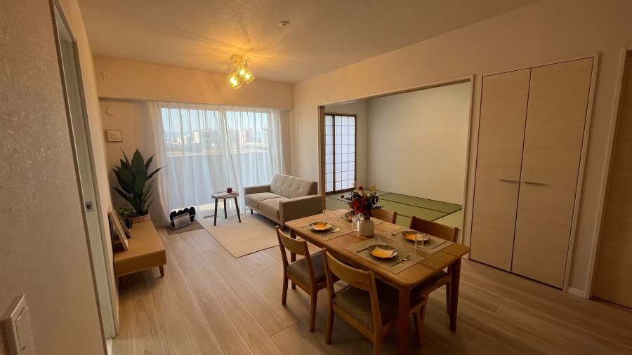 畳表替え、フローリング上張り、クッションフロア張替え、システムキッチン新品交換、ユニットバス新品交換、温水洗浄便座トイレ新品交換、シャワー付き洗面化粧台新品交換、クロス張替え、クローゼット新品交換、照明LED新品交換。