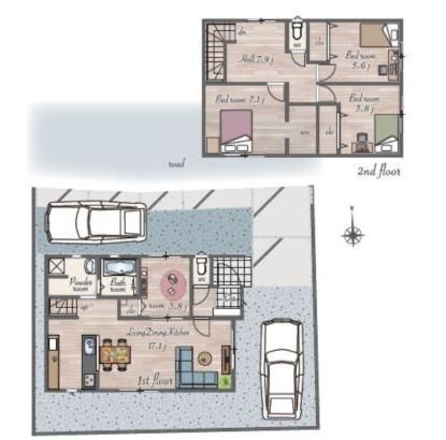 | 間取り/階数 | 4LDK((1F)LDK17.1帖・洋3.8帖 (2F)洋6.7帖・洋5.8帖・洋5.6帖) / 地上2階 | ||