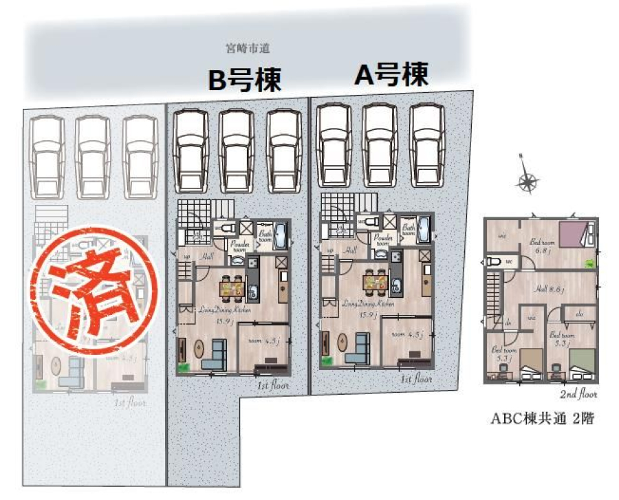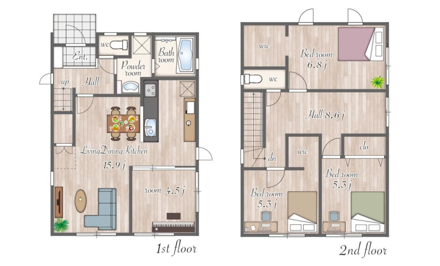 | 間取り/階数 | 4LDK((1F)LDK15.9帖・洋4.5帖 (2F)洋6.8帖・洋5.3帖・洋5.3帖) / 地上2階 | ||