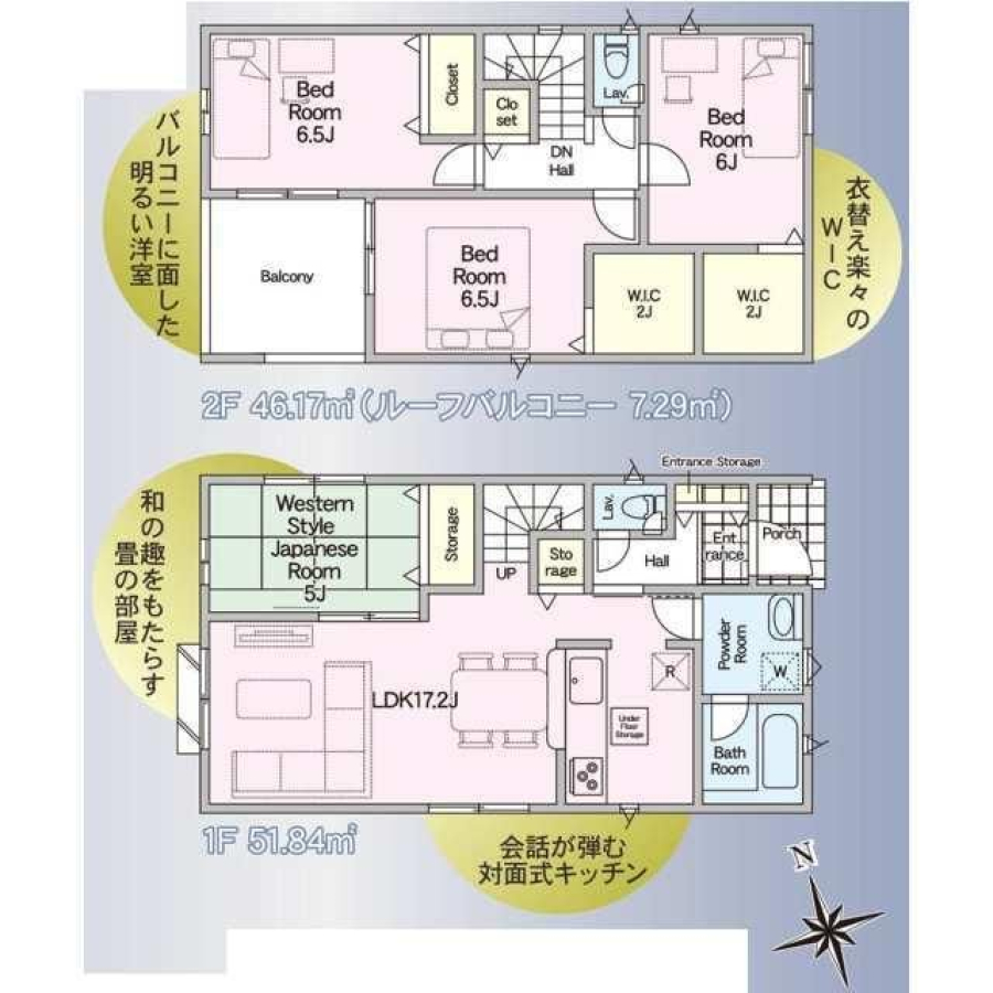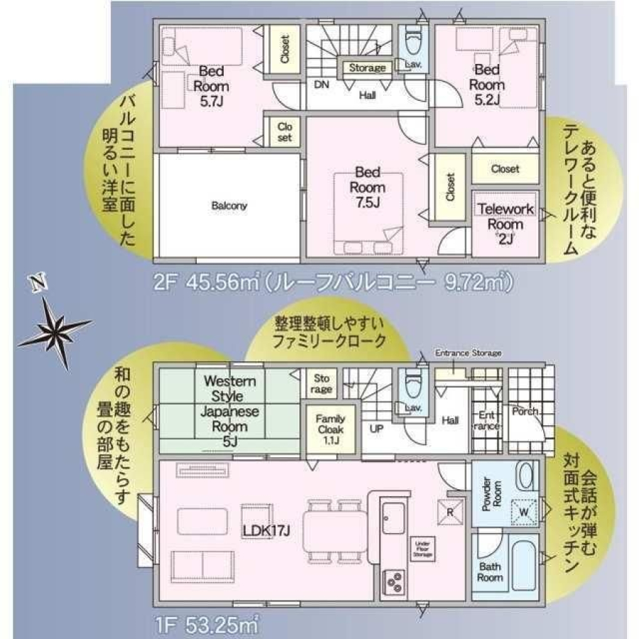 | 間取り/階数 | 4LDK((1F)LDK17帖・和5帖 (2F)洋7.5帖・洋5.7帖・洋5.2帖) / 地上2階 | ||
