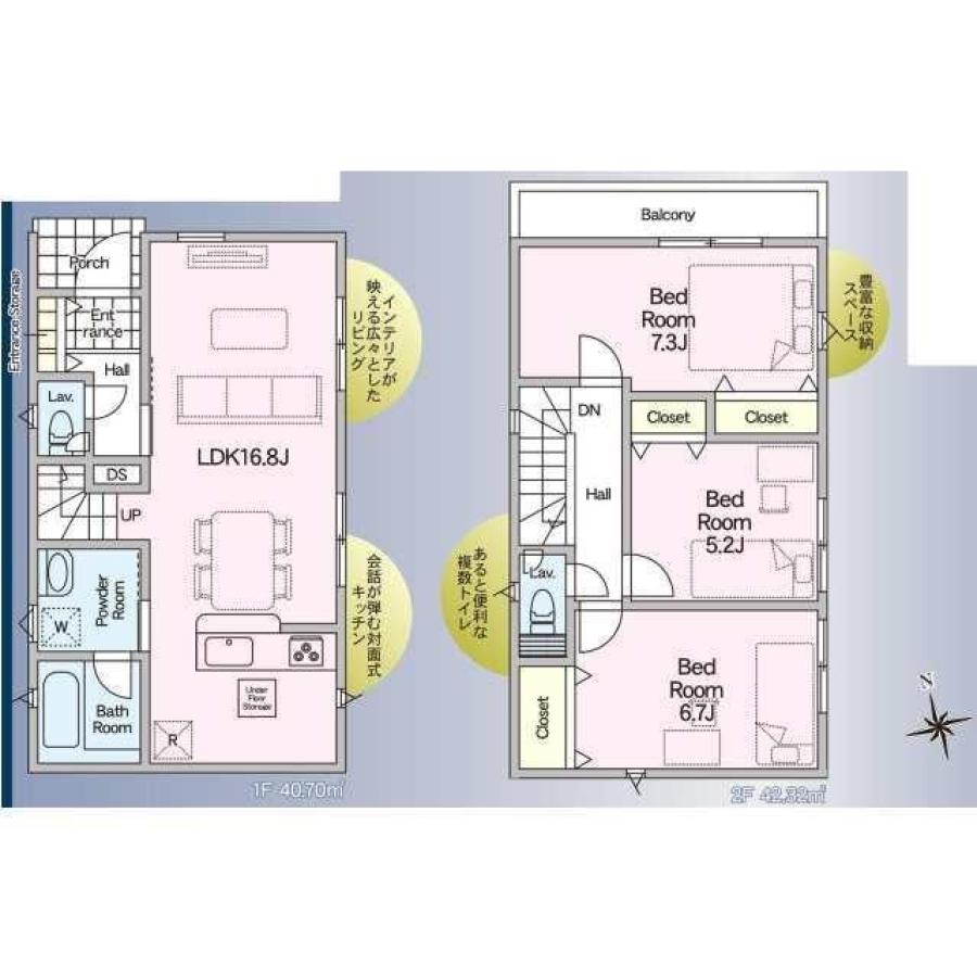 | 間取り/階数 | 3LDK((1F)LDK16.8帖 (2F)洋7.3帖・洋6.7帖・洋5.2帖) / 地上2階 | ||