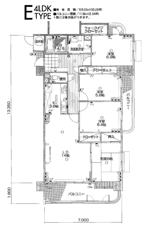 | 専有面積 | 100m²(30.25坪) | ベランダ面積 | |