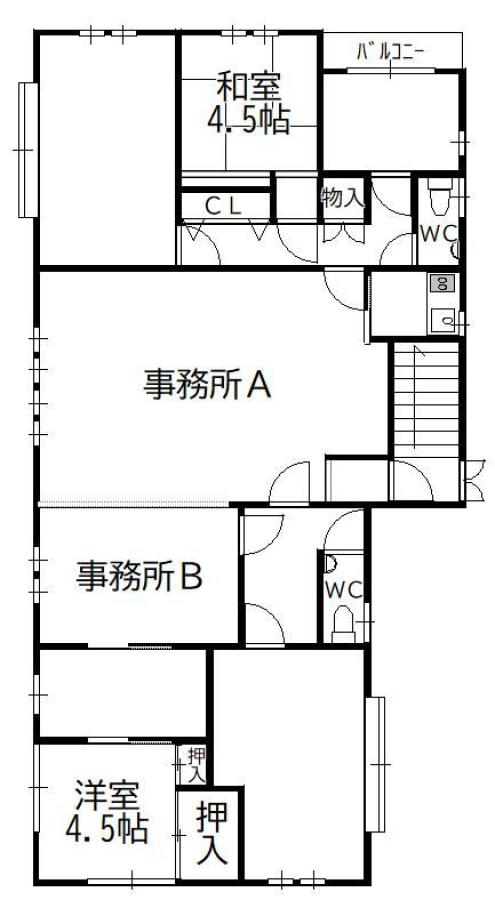 | 設備 | 事務所使用(可)水道(公営)ガス(プロパン)排水(下水)バルコニー | ||