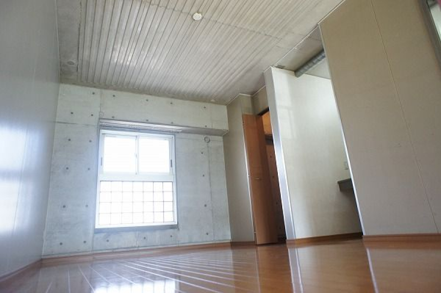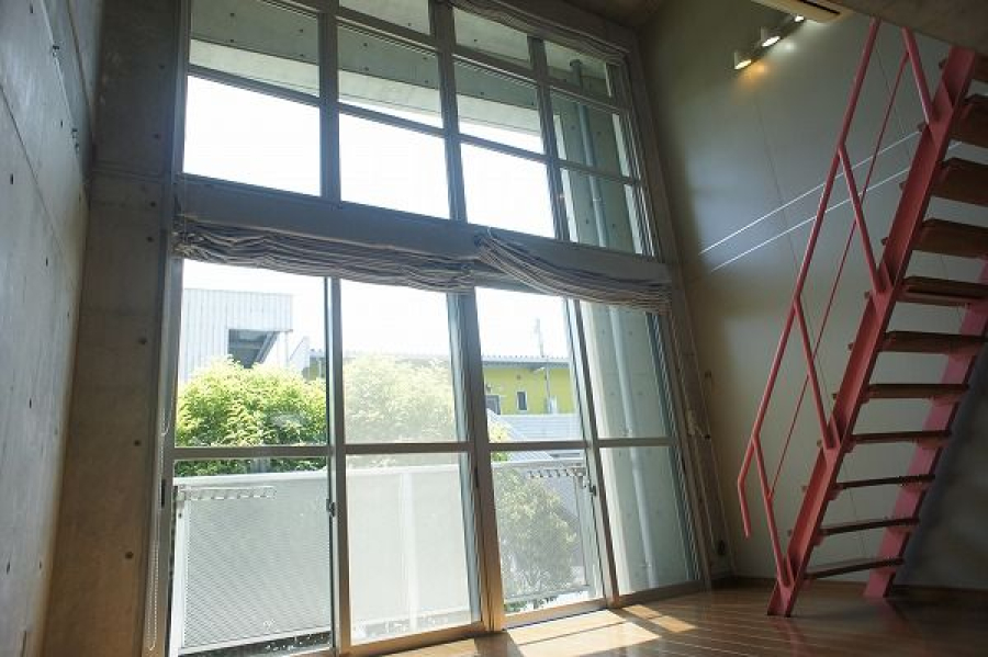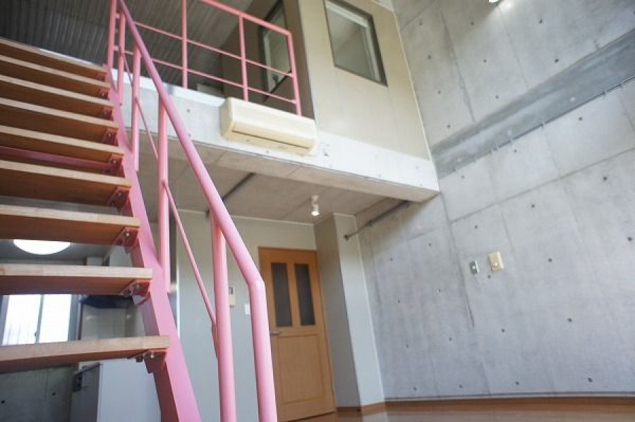 - 壁がコンクリート打ちっぱなし、巨大な窓のメゾネットタイプの物件でとてもおしゃれです。