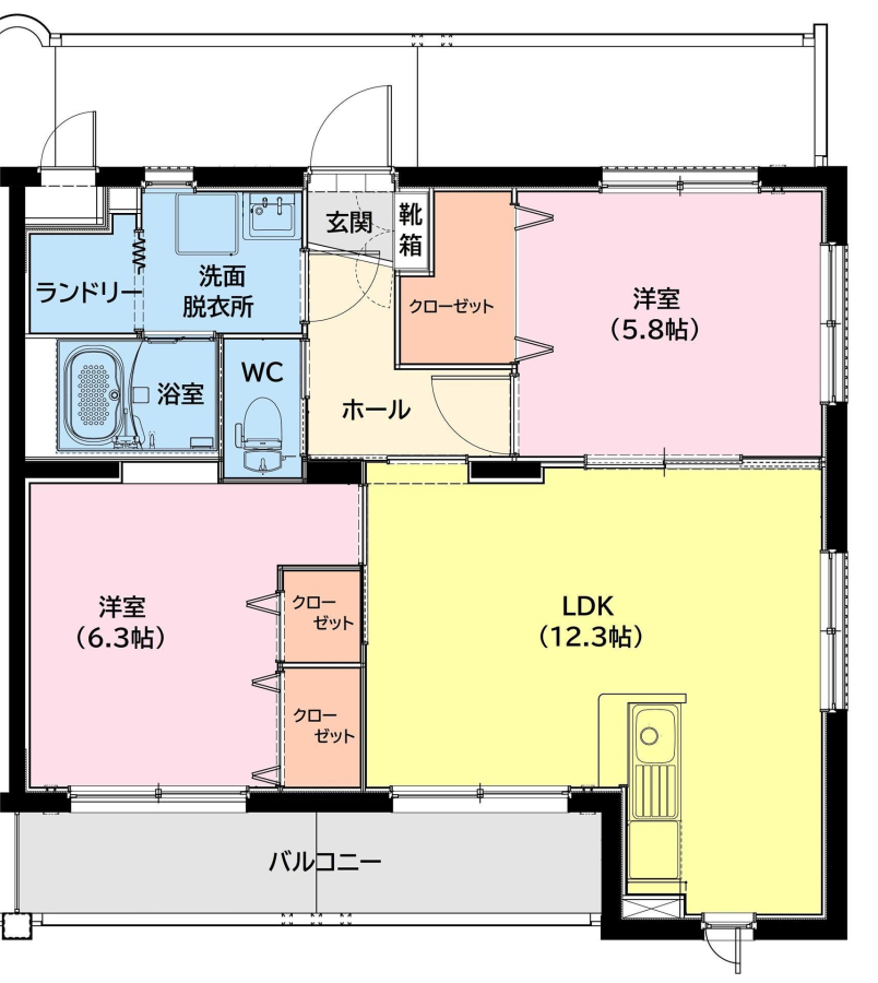 | 間取り | 2LDK(LDK12.3畳 洋室6.4畳 洋室5.8畳) | 部屋向き | 南 |