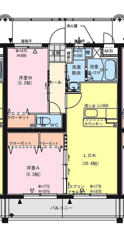 | 間取り | 2LDK(LDK10.6・洋5.3・洋5.2) | 部屋向き | 南 |