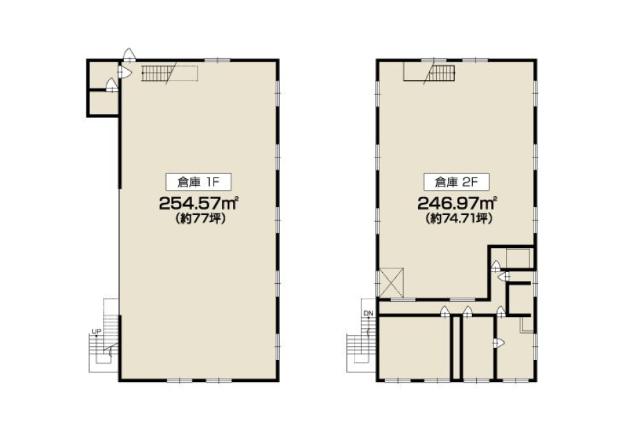 一般備考 | 事務所の他に、2階建ての倉庫が付属しております。 事務所:107.77㎡(約32.60坪) 西側倉庫:1F部分 254.57㎡(約77坪) 2F部分 246.97㎡(約74.70坪) 敷地内に、駐車スペース10台以上確保可! 業種については、別途ご相談ください。 |