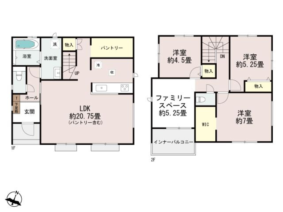 2階にはウォークインクローゼットや趣味スペース等お好きに使用できる5.2帖程のファミリースペースがあります!1階は、家族と会話しながらお料理もできる対面式キッチン仕様、キッチンのすぐ後ろにはパントリーも付いていますので、キッチン用品の収納等にも便利です。リビングは広々20帖ありますのでご家族でゆったりお過ごしいただけます。駐車場は約2台駐車可能です!