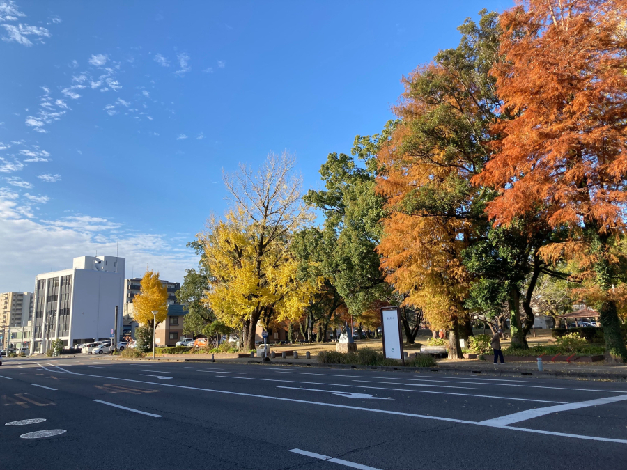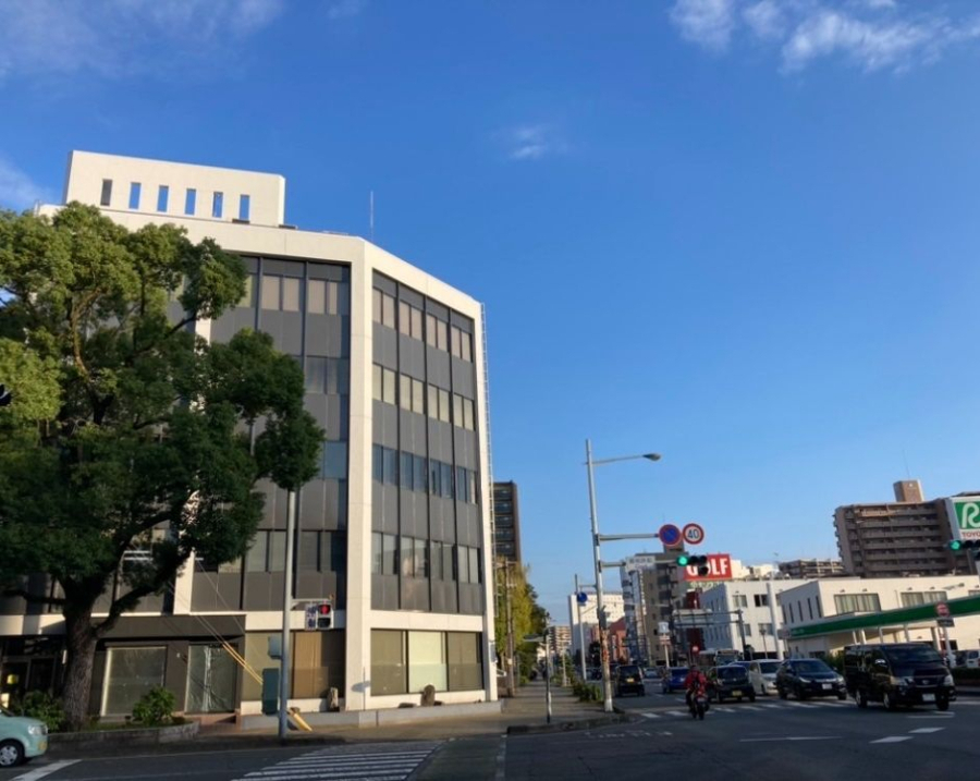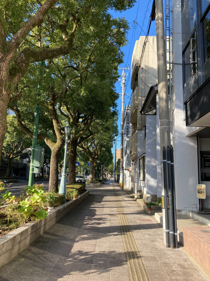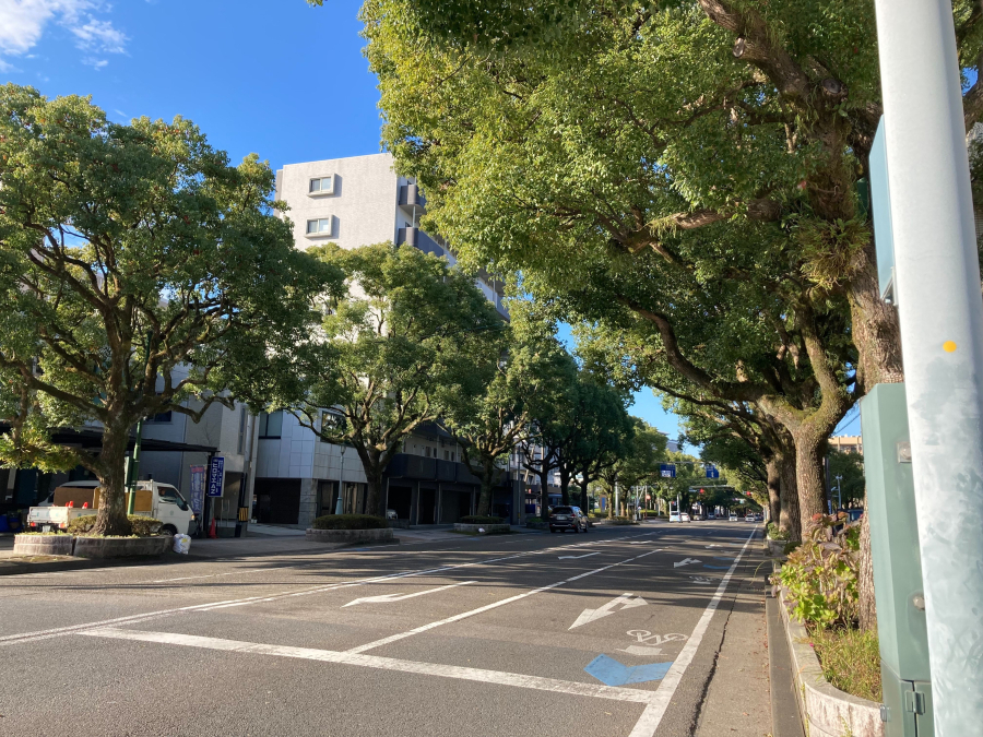 - 宮崎駅前から続く老松通り沿いにあり、楠並木通りの東入口の角地。気分転換に木々の中を歩いてリフレッシュできる落ち着いた環境となっています。